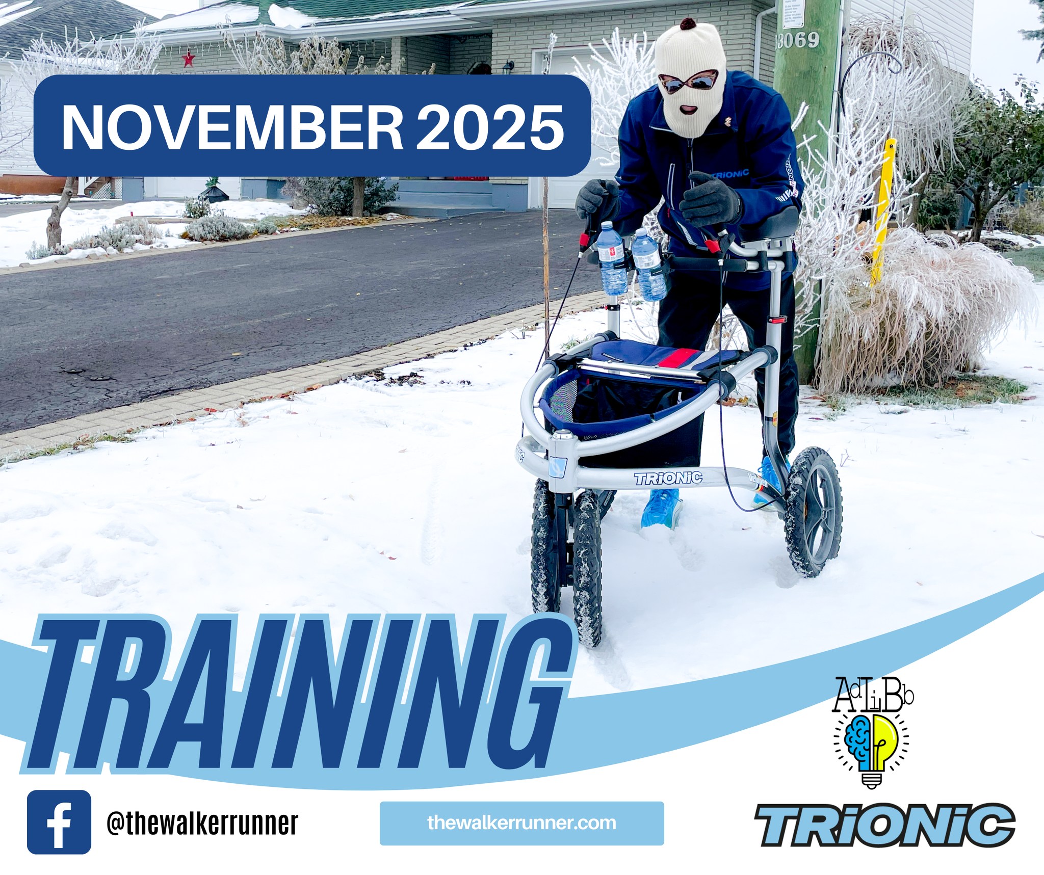 To prepare, he’s outfitted his Trionic racing walker with 14-inch wheels and off-road tires, and he layers up like a true northern athlete: double shirts, two sets of winter tights, thick socks… and most recognizably, a full balaclava.
